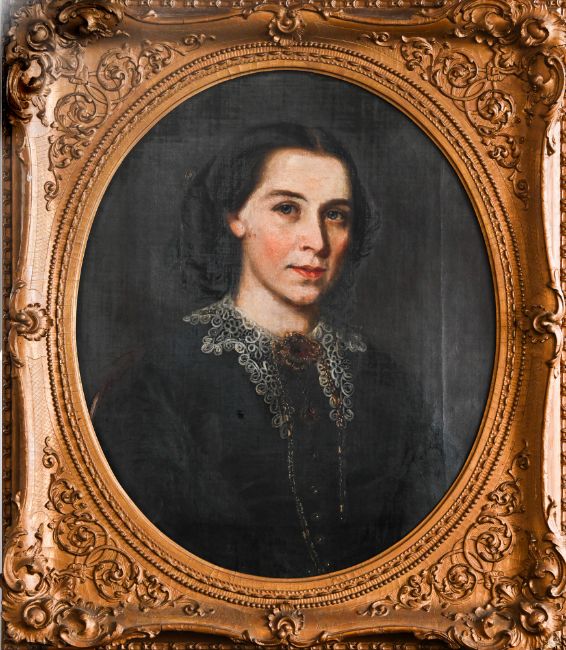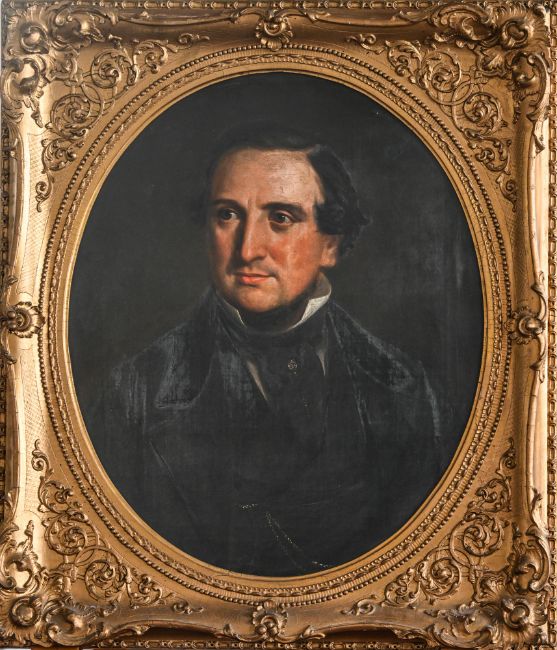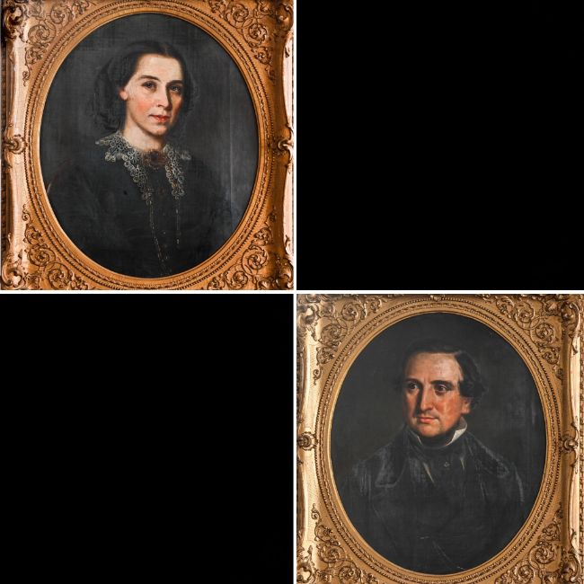 Pair of 19th century portraits in oval original gilt frames, overall size 78cm x 67cm. Depicting Thomas Washington (1824-1872) and Eleanor Budden (1825-1857). They have been handed down through generations of the Washington family who were Drapers in the Huddersfield area and later Chemists in South Devon.