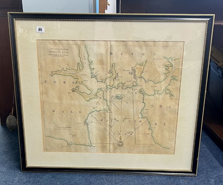 A 19th century sea chart of Plymouth Sound. Showing the Catt-water and Ham-owse. 46cm x 58cm. Framed and glazed.