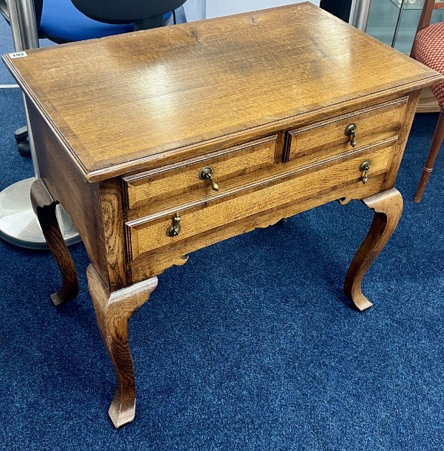 An Oak Lowboy (approx. 76 x 46 x 71cm), front features 3 drawers, drop pull handles. Top two drawers are 4cm depth, and bottom drawer is 6cm depth. Damage of sawn off pieces under the front of the Lowboy.