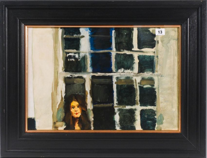 Robert Lenkiewicz (1941-2002) oil on board, Project 4 'Love and Romance 1975', depicting a woman at a window, framed and glazed, overall size 54cm x 70.5cm.