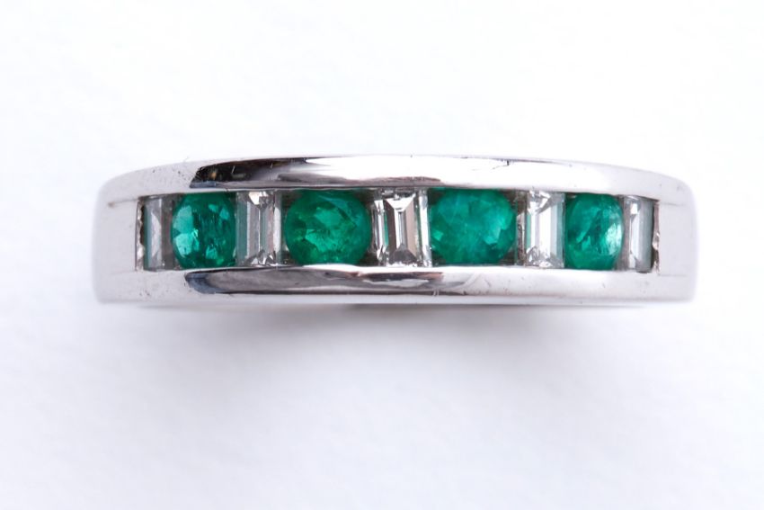An 18ct white gold half eternity style ring set with four round cut emeralds, total weight approx. 0.32 carats, interspaced with five baguette cut diamonds, total weight approx. 0.40 carats, 6.40gm, size L 1/2.