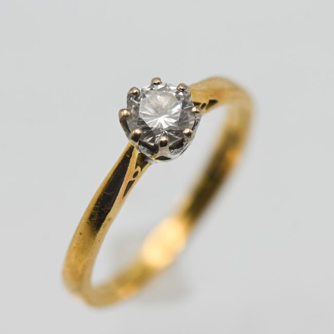 An 18ct yellow gold diamond solitaire ring, size M/N.