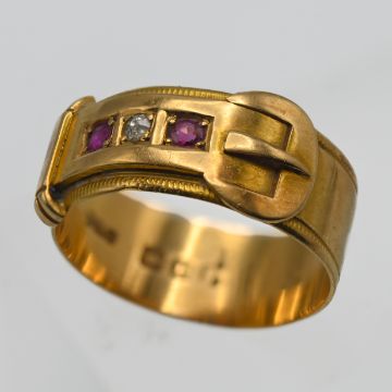 An 18ct ruby and diamond set buckle ring, approx 4.40g, size N.