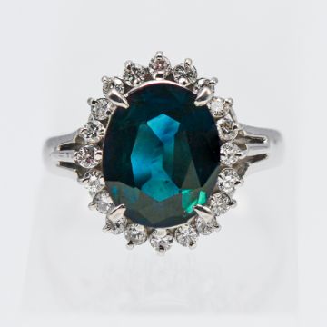 A platinum sapphire and diamond cluster ring. centre oval cut natural sapphire 2.90ct. surrounded by twenty modern brilliant cut diamonds total 0.37ct, platinum 900 claw mount, size J, with GWLAB jewellery report.