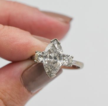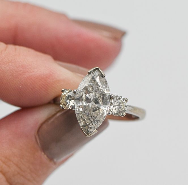 An 18ct white gold marquise cut diamond, approx 2.49ct set with two round diamonds and approx 0.30ct each, total weight 5.09ct, size O/P.