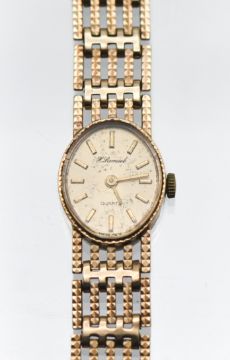 An 9ct yellow gold watch .H Samuel, gate bracelet style, quartz movement , champagne dial .17.5 grams.