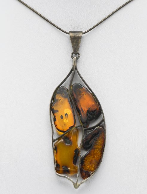 An unusual arts and crafts style amber and white metal set pendant, length 10cm including pendant drop.