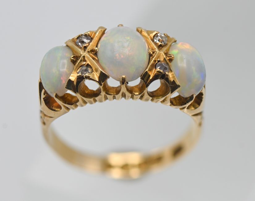 An 18ct gold three stone opal and diamond ring, size K/L.