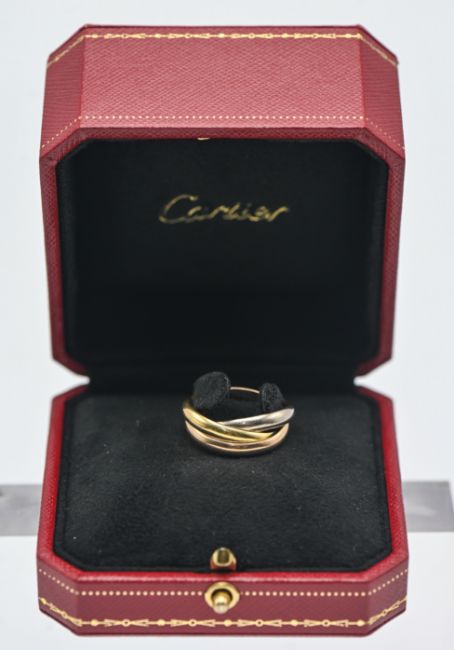 Cartier, an 18ct three tone gold trilogy ring with cartier certificate, number 075397 dated May 2010, boxed.