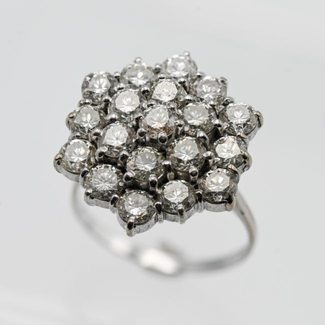 An 18ct diamond cluster ring, with a three tier cluster formation set with nineteen modern brilliant cut diamonds in a white gold claw set mount, diamond approx. 3.80ct, size S.