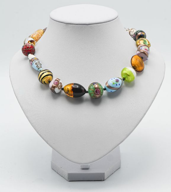 A Murano ornate enamelled glass necklace, handmade and set in sterling silver, Venezia.