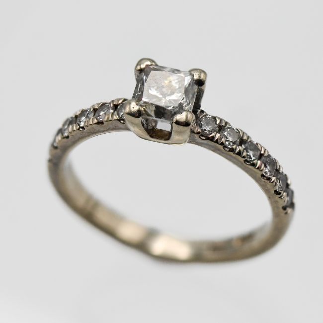 A 14ct white gold diamond single stone ring, princess cut centre stone 0.71ct F-G Colour/ VS1, diamond set shoulders 10 x modern brilliant cuts total weight 0.30ct, size M, with certificate.