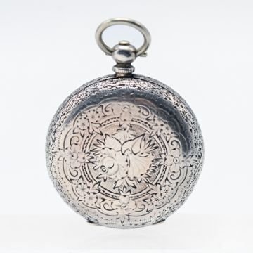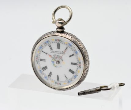 A ladies silver pocket watch, hallmarked, roman enamel dial with painted floral decoration, by Kay Jones & Coy, boxed, with key.
