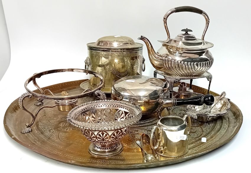 A collection of silver plated items, comprising of a picnic kettle, waffle warmer, sugar tongs and others along with a Benares brass tray, diameter approx 62cm (12).