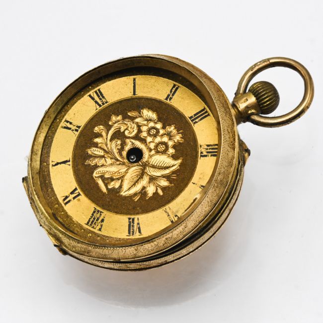 An 18ct ladies fob pocket watch with engraved foliate design (dial loose, missing hands and glass), overall weight 26.1g.