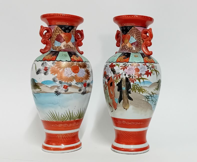 A pair of Japanese Vases, painted decoration of lake scene, height 25cm. (2)