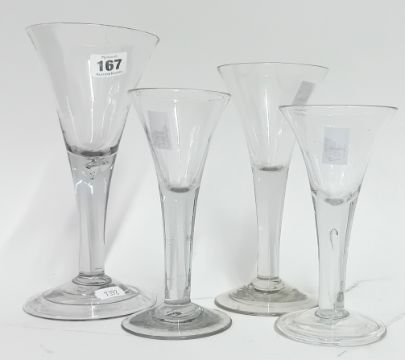 Four 18th century trumpet wine glasses, comprising two with folded rims and stem air bubble, max 21cm. (4)