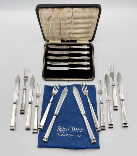 A set of silver handled butter knives, stainless steel blades, by Firth's of Sheffield, boxed (one missing), hallmarked Sheffield 1933, together with a Mappin & Webb fish service (17).