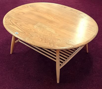 An Ercol beech oval coffee table, with turned wood magazine rack, height 44cm, length 99cm