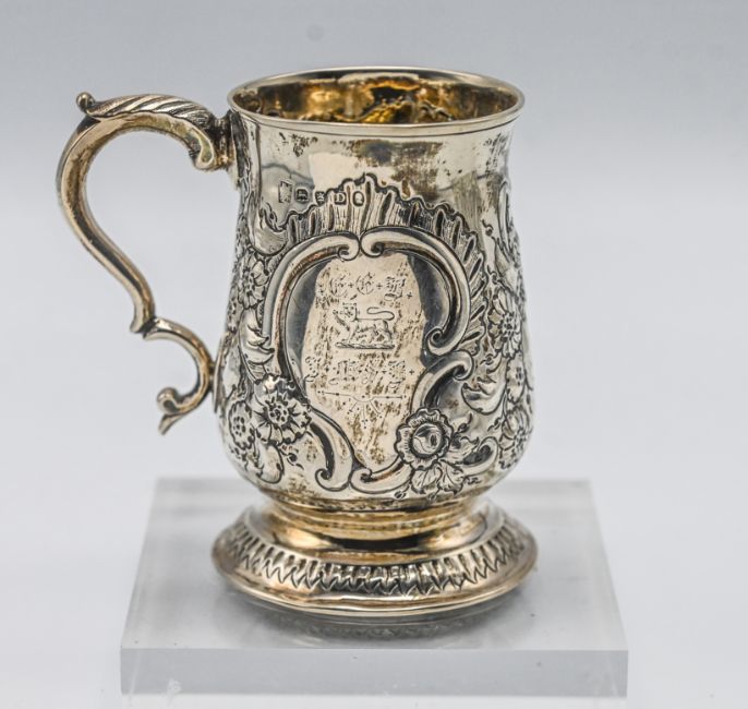 A late 18th century silver mug, with embossed foliate decoration, engraved with lion, hallmarked London 1799, silver weight 4.98oz.
