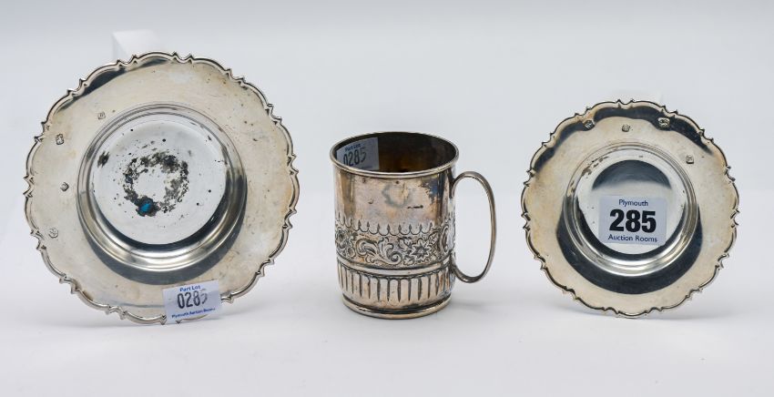 Two small silver saucers, hallmarked Sheffield 1996-97, together with a Victorian silver mug, embossed foliate decoration, hallmarked Birmingham 1893, total silver weight 6.57oz. (3)