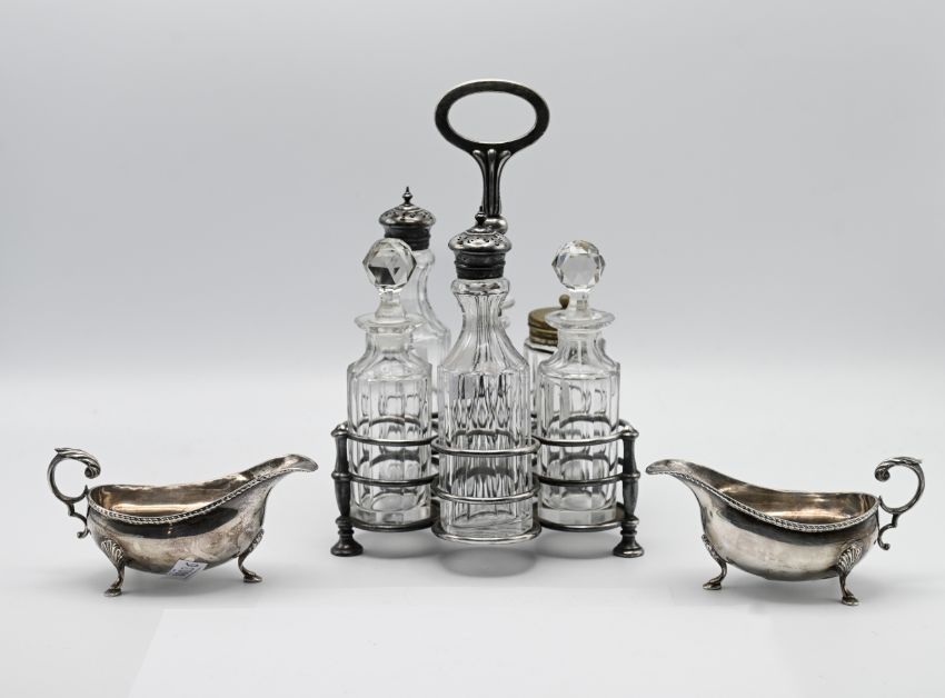 A pair of 20th century silver gravy boats, hallmarked Birmingham 1982, maker W I Broadway & Co., silver weight 7.29oz, together with a silver plated six-piece cruet set by Elkington & Co. (9)
