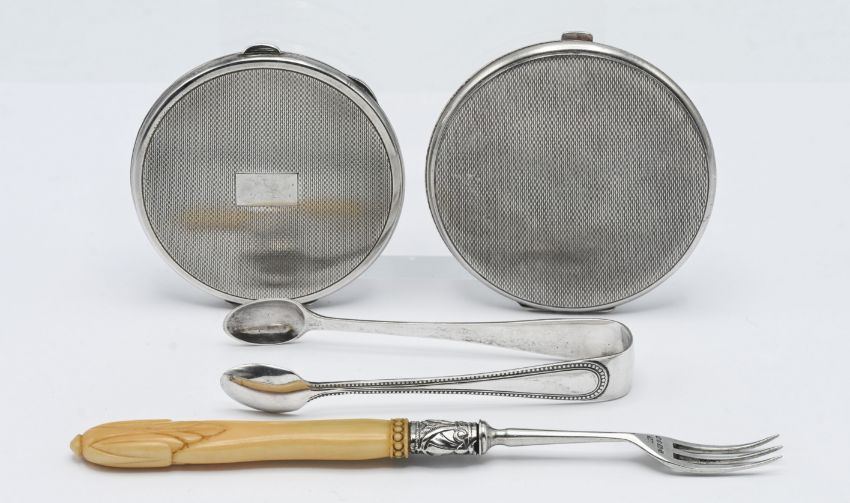Two silver compacts, together with a pair of sugar tongs, hallmarked Sheffield 1909, and a silver pickle fork, hallmarked Sheffield 1867. (4)