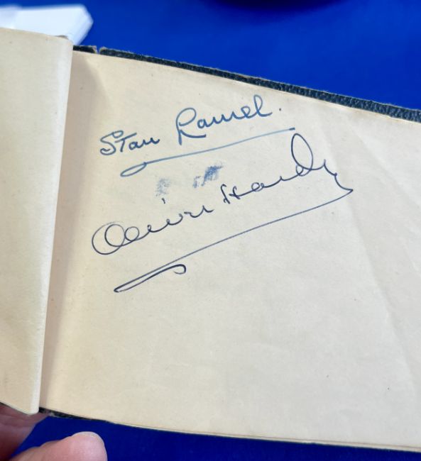 Laurel and Hardy. A mid 20th century autograph album, to include the signatures of the comedy duo Stan Laurel and Oliver Hardy. The owner of the album queued for their autographs at the Wimbledon Stadium when the pair were touring in the UK circa 1949. History from the owner: 'When she met them, they picked her up and kissed her on the head'.