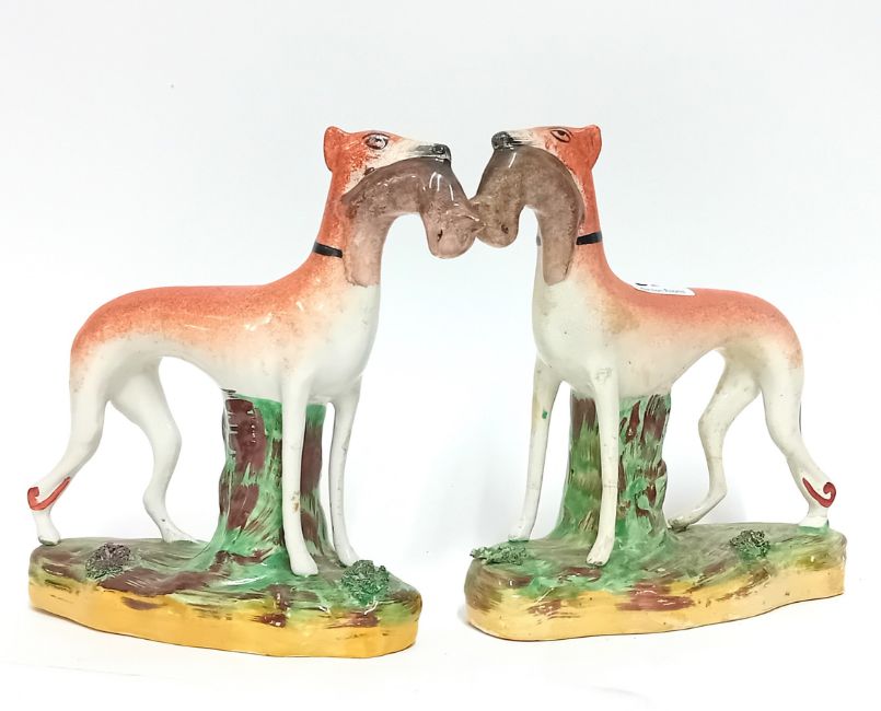 A pair of Staffordshire hunting dogs on a green base, height 20cm. (2)