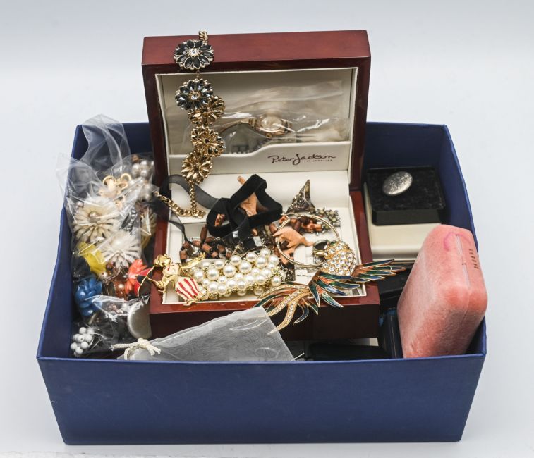 A collection of costume jewellery to include brooches, necklaces etc.