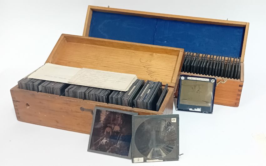 A collection of early 20th century magic lantern slides, of predominantly landscape, tourist and locomotive subject matter, a painted slide of Windsor Castle choir, in fitted wooden boxes, approx quantity 142 slides.