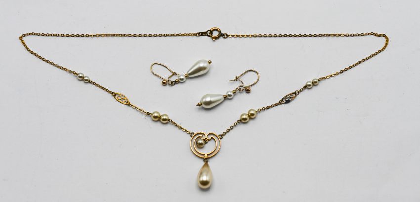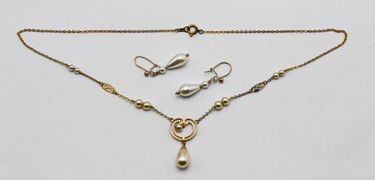 A pearl and gold suit including pair of earrings and pendant on chain.