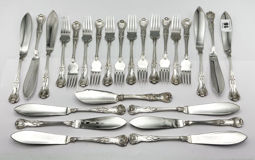 A silver King's pattern fish service with shell back, comprising of twelve fish forks and twelve fish knives, hallmarked Sheffield 1973, maker J.E&S Joseph Elliot and Sons, together with a Victorian kings pattern fish knife, hallmarked London 1845, overall silver weight 50.96oz (13).