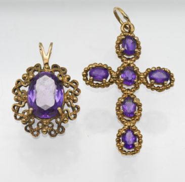 A 9ct gold cross pendant, set with amethysts, and a 9ct amethyst pendant, overall gold weight 8.3g.