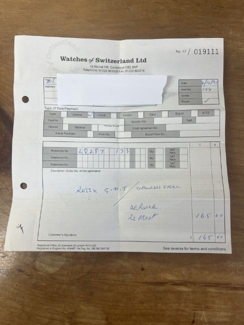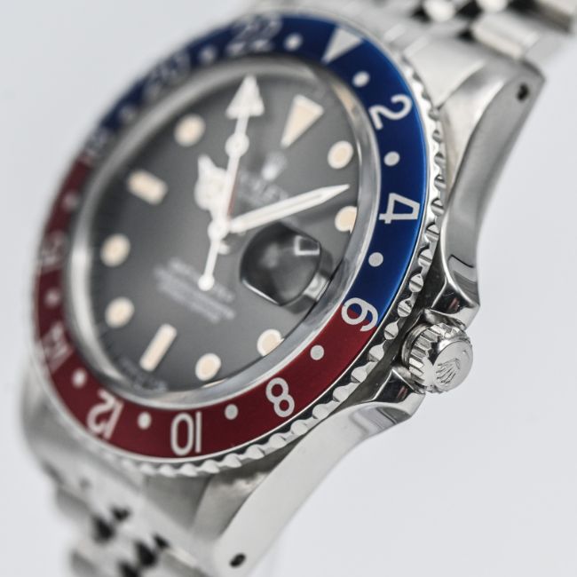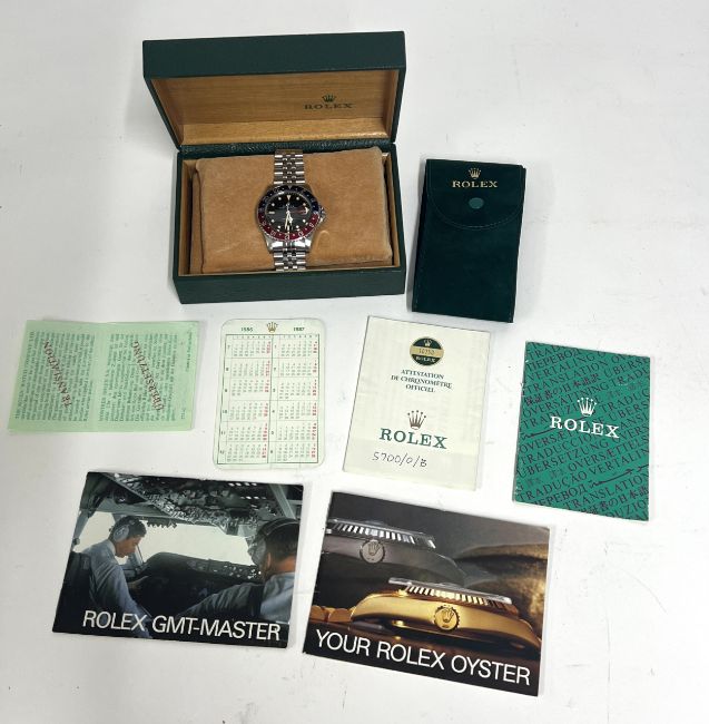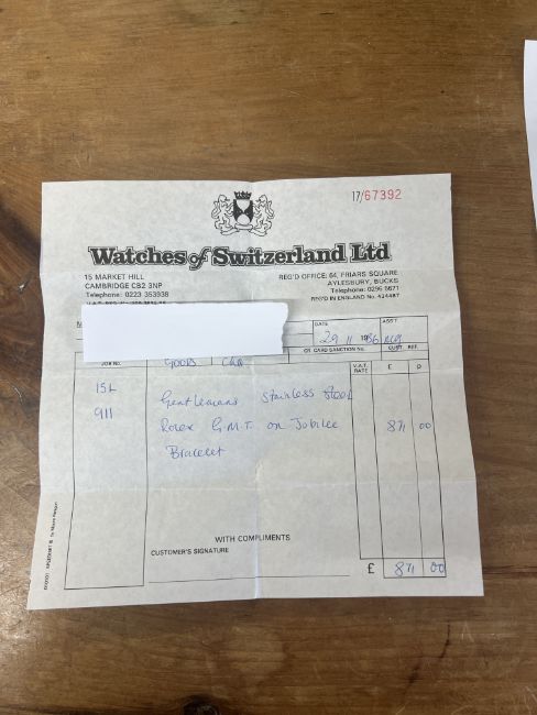 Rolex, a rare 1986 Oyster Perpetual Date GMT-Master. stainless steel wristwatch with Pepsi bezel, model 16750, Serial 8566917, jubilee bracelet, with original receipt from 29.11.1986 from Watches of Switzerland (price £871.00), also service receipts from W of S, 1986/87 date calendar. service hands, original jubilee bracelet and end links.