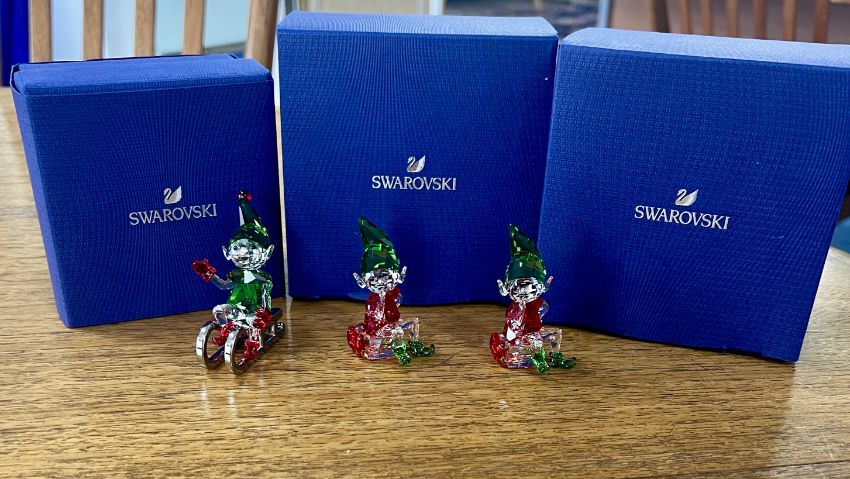 Swarovski Crystal Glass, three pieces including 'Santa's Elf on Sleigh' and two 'Santa's Elf - 2018', all boxed.