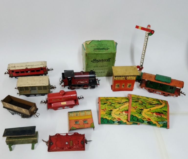 A L.M.S 20V locomotive and Ingersoll Atlantic Radiolite Alarm, in addition to a transformer, 12 pieces of tin plate train carriages and buildings, and 20 pieces of railway track (35)