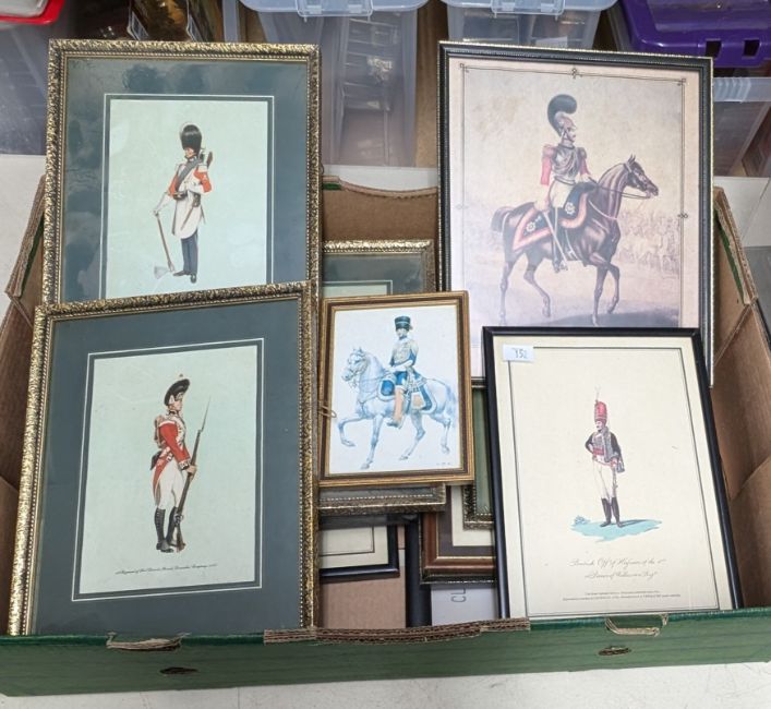 A model of 'Private 1st Bengal European Regiment 1737' in a Perspex display box, with 3 other models in display boxes, and 1 model, unboxed, also with 13 framed prints of Napoleonic guards. The display cases are approx. 23 x 20 x 36cm. (18) [1 display box missing front panel]