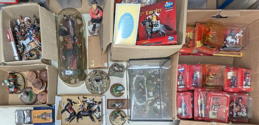 Del Prado, approx. 31 figures of soldiers, officers and captains from the Napoleonic war, boxed, in addition to 2 dioramas of soldiers, a metal painted figure of "5th Hussars 1809", a Ravel Quartz pocket watch, 3 boxes of models, unboxed, and wooden plinths, etc. (approx. 38+)