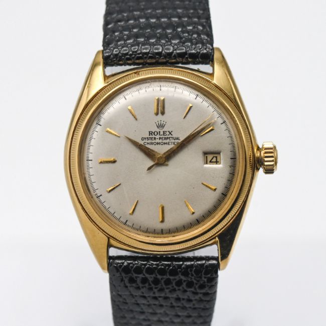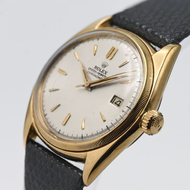 Rolex, a 1950's gents 18ct Oyster-Perpetual Chronometer wristwatch with date, on leather strap, bubble back, non original crown.