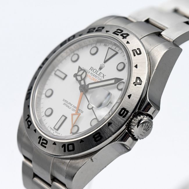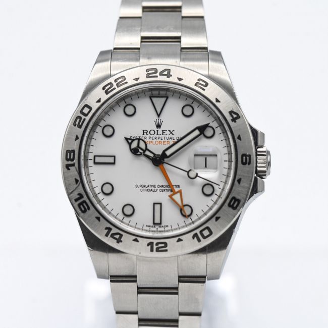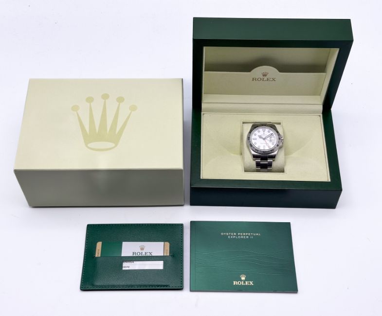 Rolex Explorer II, a 2014 gents Oyster Perpetual Date, stainless steel wristwatch, white dial with baton hour indices, box and papers, model 216570, serial 560W35V4, 77210 white, tag, slide.