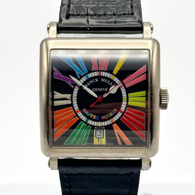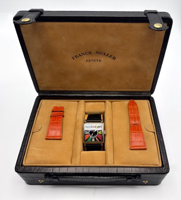 Franck Muller, a rare 2006 gents 18ct white gold cased Geneva 'Master Square' automatic date wristwatch, with colour dreams dial, number 17, model 6000HSCDT fitted with a black leather strap, box and papers also an original spare orange strap. Condition- in running order, some minor scratches to the case, strap in good order.