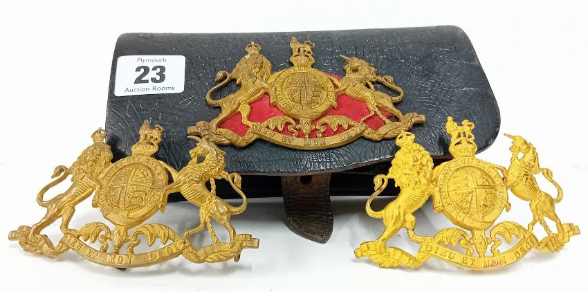A WWI/WWII black leather military belt pouch, fitted with 'Dieu et mon Droit' badge, together with two more badges.