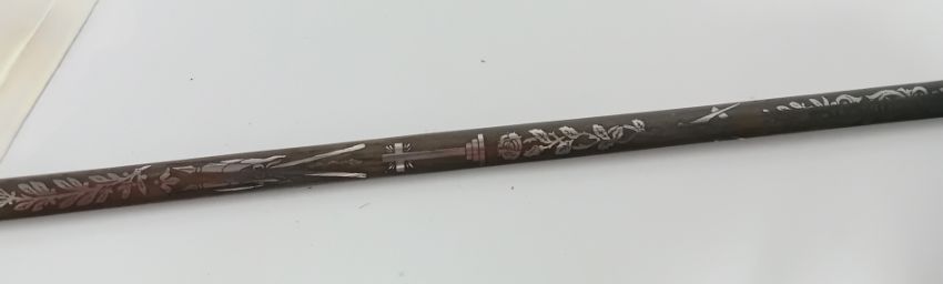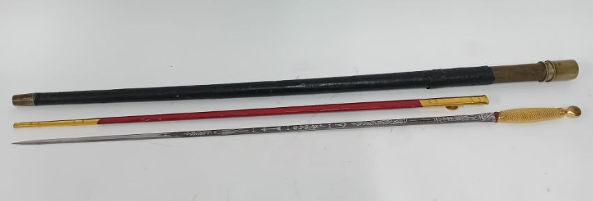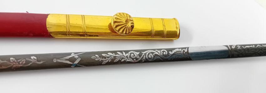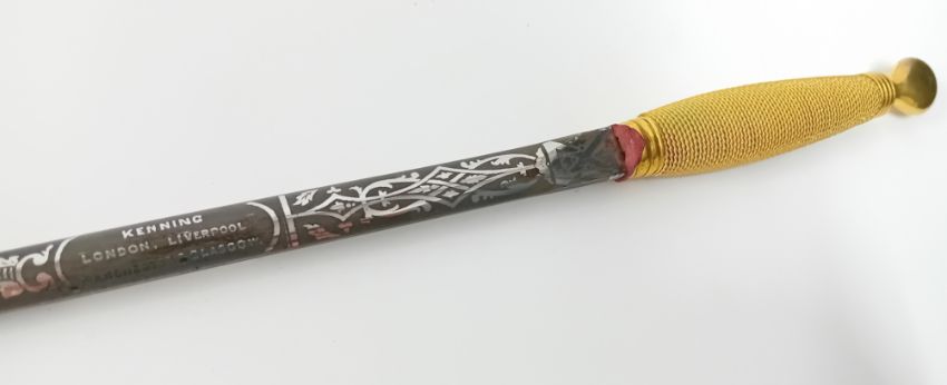 A Freemason ceremonial sword, gilt wire wrapped handle, blade engraved with foliate design and 'Kenning, London, Liverpool, Machester, Glasgow'.