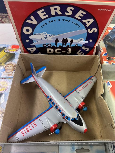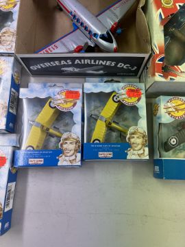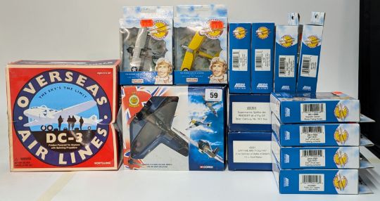 Corgi, 'The Aviation Archive' - 'Battle of Britain', 49101 - 'Hawker Hurricane MKI 85 Sqd RAF - Sqd Ldr Peter Townsend' model aeroplane with 2 'Battle of Britain', 1 Schilling 'DC-3 Friction Powered Tin Airplane', and 10 Lledo 'Pioneers of Aviation' models , all boxed. (14)