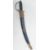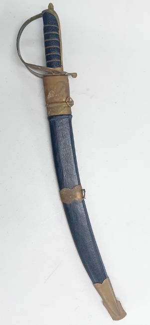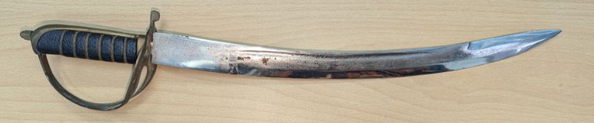 A 19th century near Eastern short sword and scabbard, leather grip wrapped with copper wire, the slightly curved blade decorated with Arabic? Motifs, blade length approx 36cm.