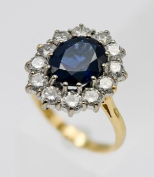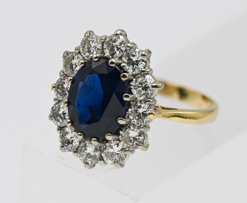 A fine 18ct sapphire and diamond cluster ring, set in yellow gold, with an oval brilliant cut sapphire and twelve modern brilliant cut diamonds, with white claw set, diamond weight approx 1.40ct, size N.
