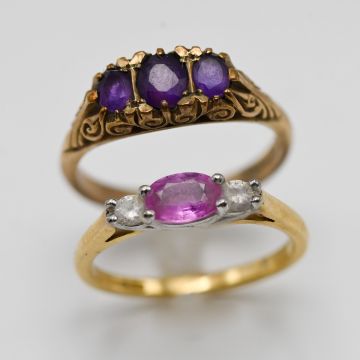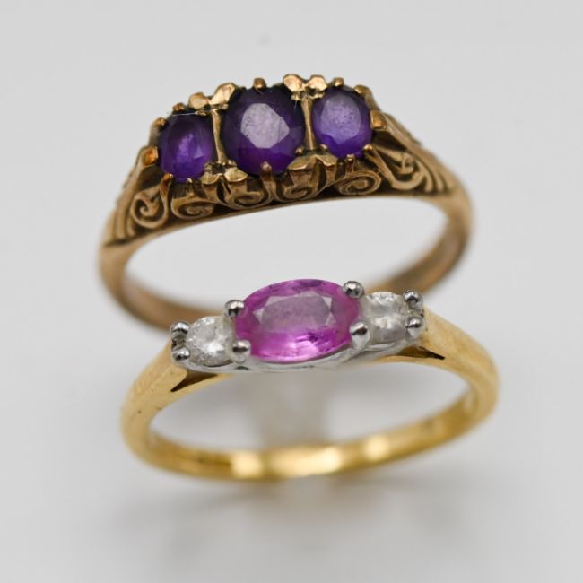 A 9ct amethyst three stone ring, approx 3.2g and an 18ct pink sapphire three stone, approx 2.9g (2)