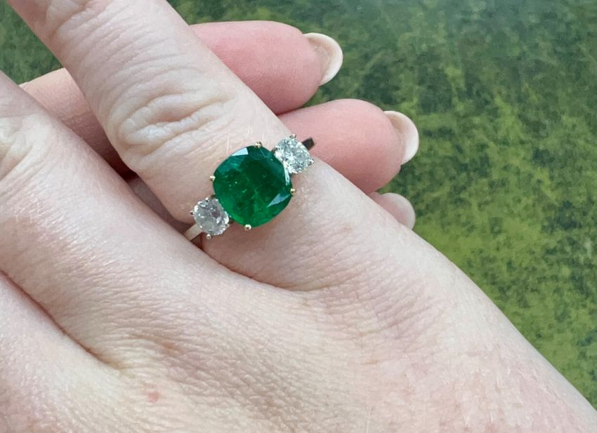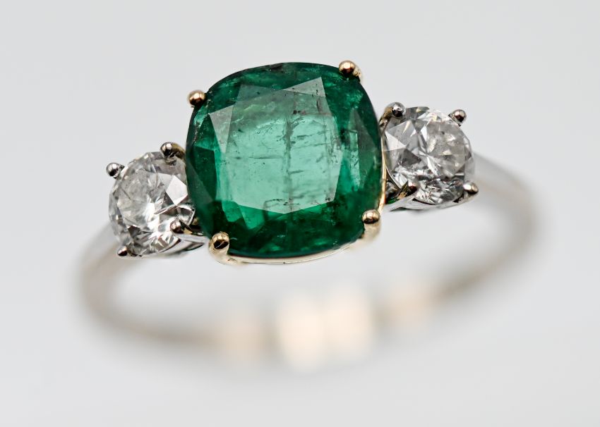 A diamond and rectangular cushion shape emerald three stone ring, the approx. weight of the emerald is 1.24ct, heavily included H1, the approx. weight of diamonds in total 0.54ct, colour H, clarity I1, round brilliant cut, size K, assessed to be 18ct gold, no hallmarks, with copy of valuation replacement, valued at £6,750.00 dated September 2023.