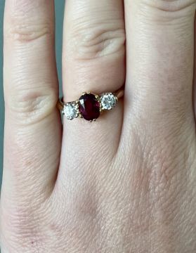 An 18ct yellow gold ruby and diamond three stone ring, stamped PLAT, size J/K.